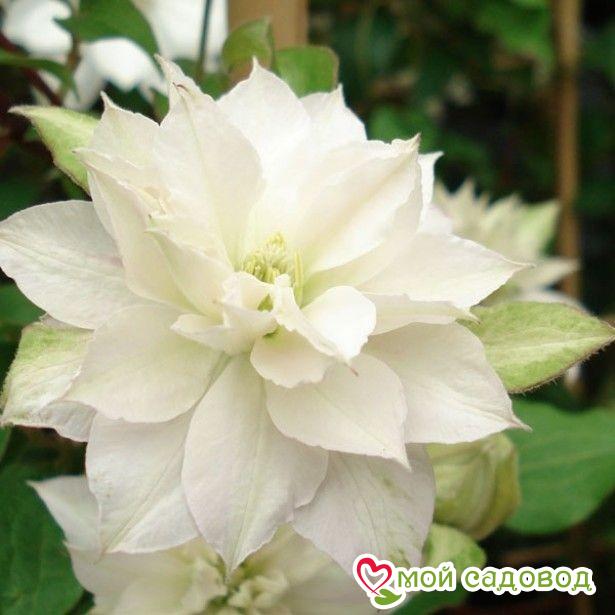 В высоту лиана достигает 2 м. Цветет на прошлогодних побегах. Обычно это происходит в мае-июне. Цветки формируются махровые. Вторая волна начинается в июле-августе, на побегах текущего года. Теперь уже цветки образуются простые или полумахровые. В полном роспуске диаметр цветков равен 6 – 8 см. Лепестки окрашены в белый цвет. Все это время клематис источает упоительный аромат.